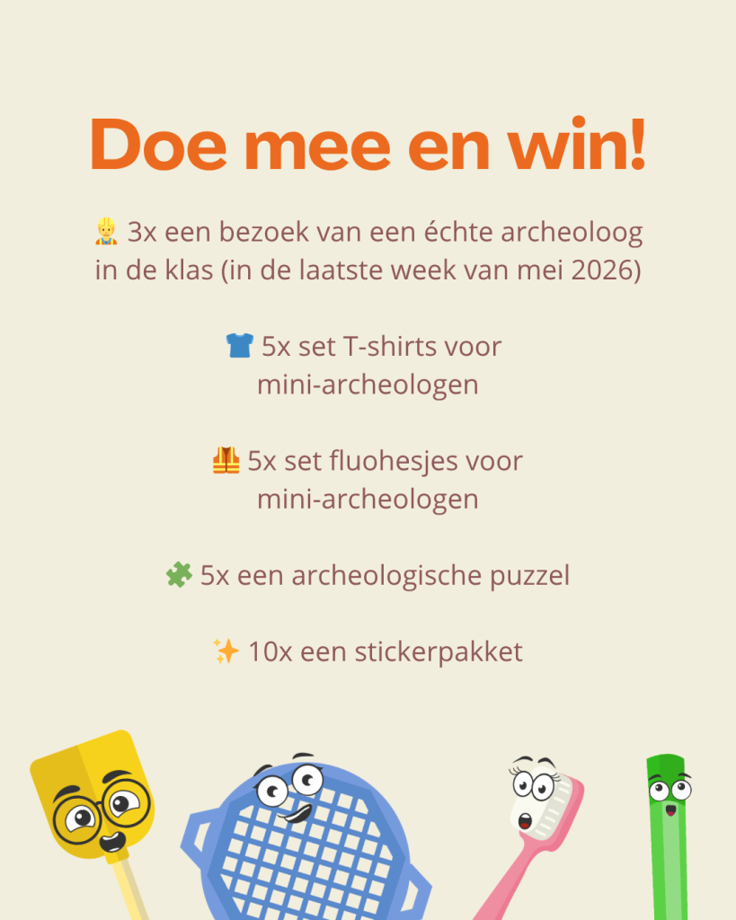 We dagen alle mini-archeologen van de derde kleuterklas uit om op ontdekking te gaan! Samen met Zoë Zeef, Sami Schop, Tanya Tandenborstel en Stavros Stift leren kleuters spelenderwijs wat archeologie is, hoe je wetenschappelijk onderzoek doet en hoe techniek daarbij helpt. We prikkelen hun nieuwsgierigheid en stimuleren een ontdekkersmentaliteit door hen actief te laten onderzoeken, denken en maken.